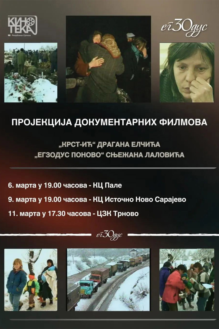 На Палама ће данас, поводом обиљежавања 30 година од егзодуса Срба из Сарајева, бити приказани кратки документарни филмови „Крст-ић“ и „Егзодус поново“ режисера Драган Елчић и Сњежан Лаловић.